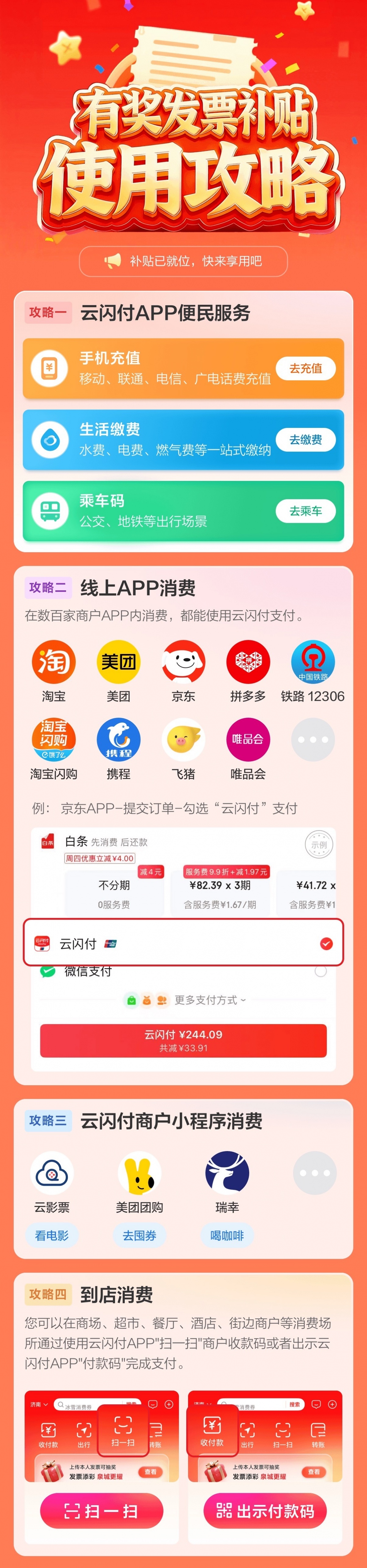 记者了解到,中奖红包可通过云闪付直接用于手机话费充值、水电燃气等生活缴费、地铁公交出行,轻松覆盖日常刚需;同时支持在淘宝、美团、京东、拼多多等数百家线上App消费抵扣,网购、点外卖、购生鲜均可使用;线下商超、便利店、餐饮门店等实体场景,也能直接用云闪付红包支付,让每一份中奖喜悦,都能转化为实实在在的生活便利。