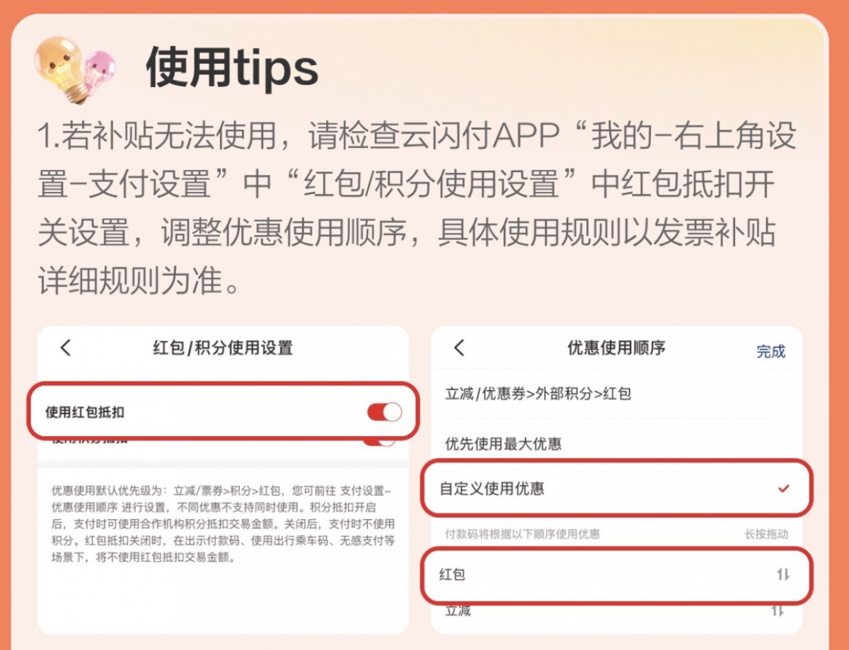 3. 在支付设置中,找到“优惠使用顺序—自定义使用优惠—将红包调整到优惠顺序第一位”。