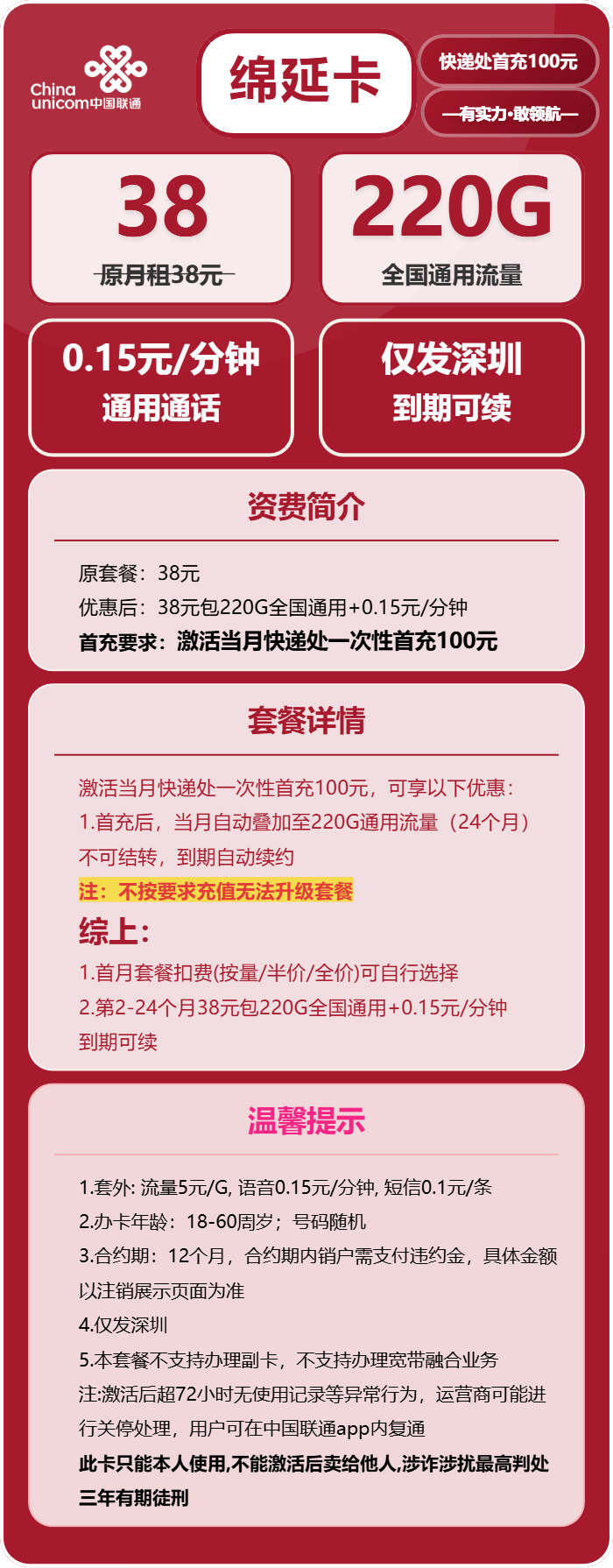 深圳联通绵延卡是38元价位的天花板,也是深圳本地专属流量卡,核心配置是38元/月含220G全国通用流量,通线元/分钟,归属地仅发深圳,号码随机。首充要求是激活当月在快递处一次性首充100元,不按要求充值无法升级套餐,首充后优惠有效期24个月,第2-24个月稳定享受38元包220G通用流量,到期还能续约。首月扣费可自选按量、半价、全价,套外资费流量5元/G、通线元/条,无隐形消费。这款卡全程不限速,流量当月有效不可结转,适合深圳联通上班族流量卡、学生流量卡使用,通勤刷视频、网课学习、日常办公都能满足,是真正的万金油款。