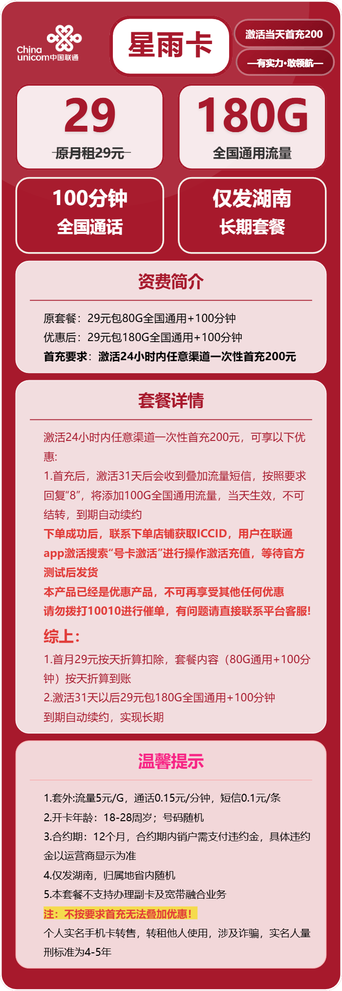 ▶ 注意事项1:首充要求是优惠的关键不管是联通星雨卡还是其他湖南联通流量卡,大部分优惠套餐都有首充要求,一定要严格按照要求完成首充,比如联通星雨卡的24小时内一次性首充200元,未按要求首充的,无法享受叠加流量的优惠,只能使用原套餐的内容,小韩聊卡遇到过不少用户因为忽略这一点,错失了大流量优惠,非常可惜。