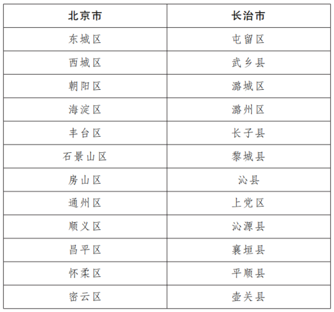 根据北京市与长治市对口合作实施方案,结合北京市各区与长治市各县区实际情况,建立对口合作结对关系如下: