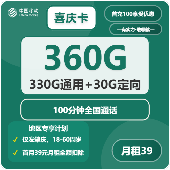 这张名为‘喜庆卡’的肇庆移动套餐,原月租为69元,但通过激活时一次性充值100元线个月的优惠,实现月租直降至39元。这39元包含的内容相当震撼:330G全国通用流量 + 30G全国定向流量,总计360G,此外还有100分钟全国通话。定向流量覆盖了头条、百度、腾讯视频、网易云音乐等上百款热门APP。单从流量总量看,在2026年初的肇庆本地市场,这款套餐堪称‘巨无霸’级别的存在,性价比非常突出。[分段]二、办理门槛与关键步骤:首充100元与激活须知