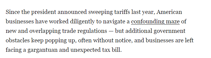 同一天,美国《》发表文章称,美国的关税政策是政府的一场大混乱。文章说自美国政府去年宣布全面征收关税以来,美国企业一直在努力应对错综复杂、且相互重叠的贸易法规。政府方面不断出台新的政策,而且往往毫无预警,导致企业面临巨额且意想不到的税单。