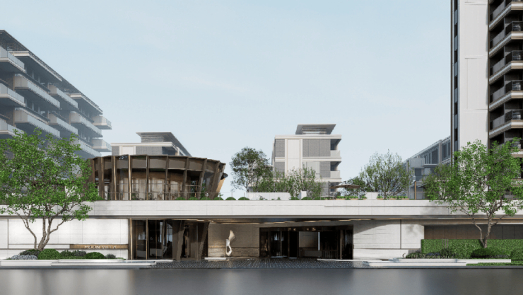 项目坐落于吴中区天灵路与枫津路交汇处,展厅设在东吴天街。这里是吴中主城当之无愧的核心,却难得地规划成了一个低密、安静的台地社区。整个社区只有186户人家,容积率低至约1.5,由洋房和叠墅组成,是主城里非常稀缺的改善型住区。