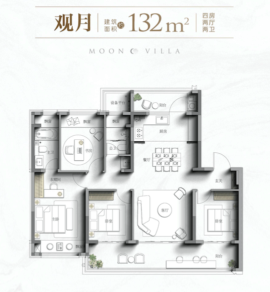 宽境洋房(建面约132㎡):经典的改善户型,约13.4米的超大面宽,搭配南北双阳台和飘窗,赠送面积近20㎡,空间感十足,是性价比很高的品质之选。