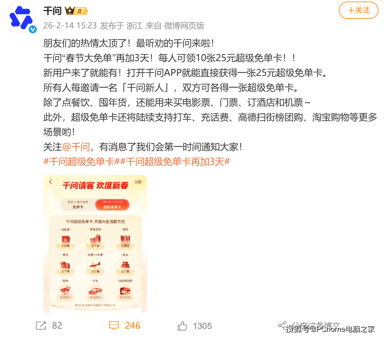 97国际-至尊品牌,源于信誉-2026年2月14日,阿里千问正式宣布,“春节大免单”活动再加三天,每人最高可领取10张25元超级免单卡。