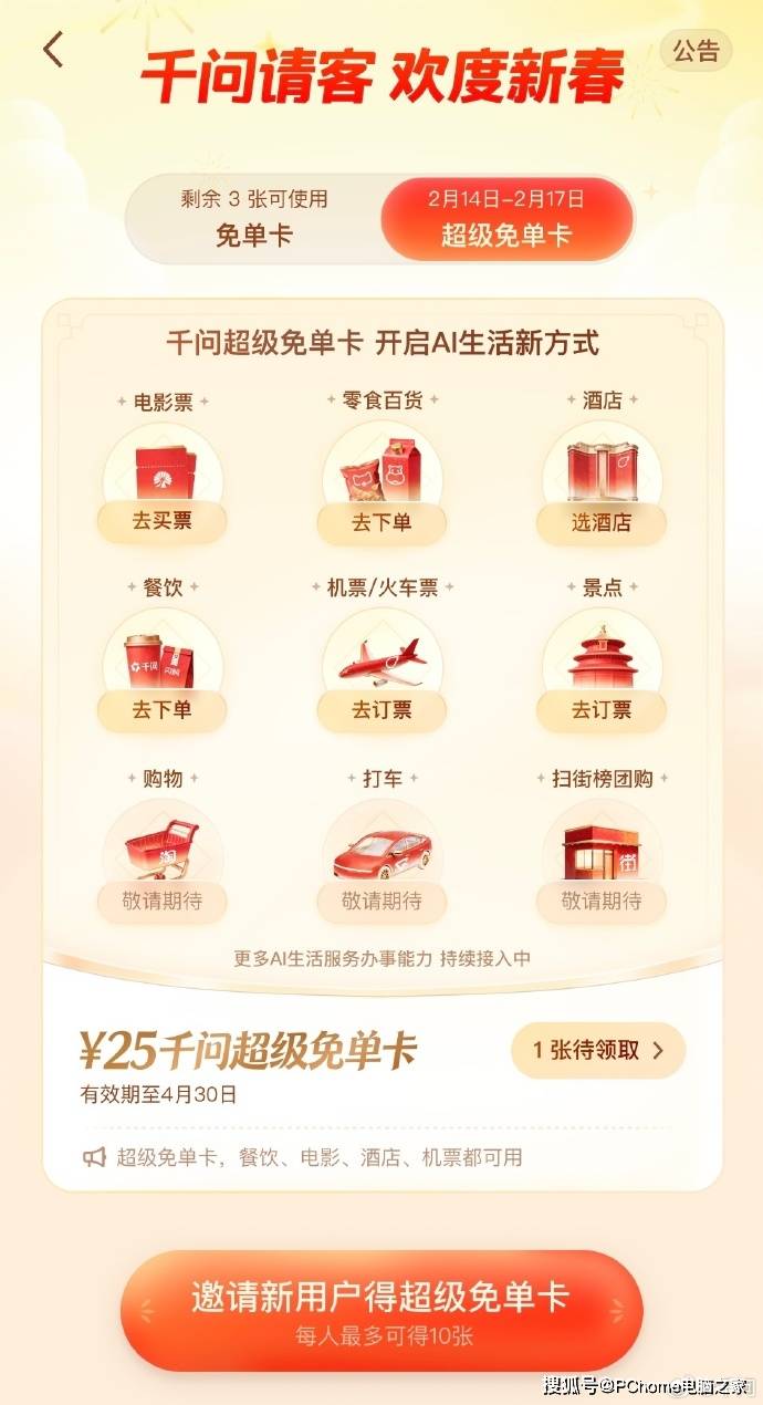 本次加时活动自2月14日下午3点启动,持续至2月17日(大年初一),为期三天;邀请好友注册使用,双方均可额外获得一张25元的超级免单卡,有效期至2026年4月30日。