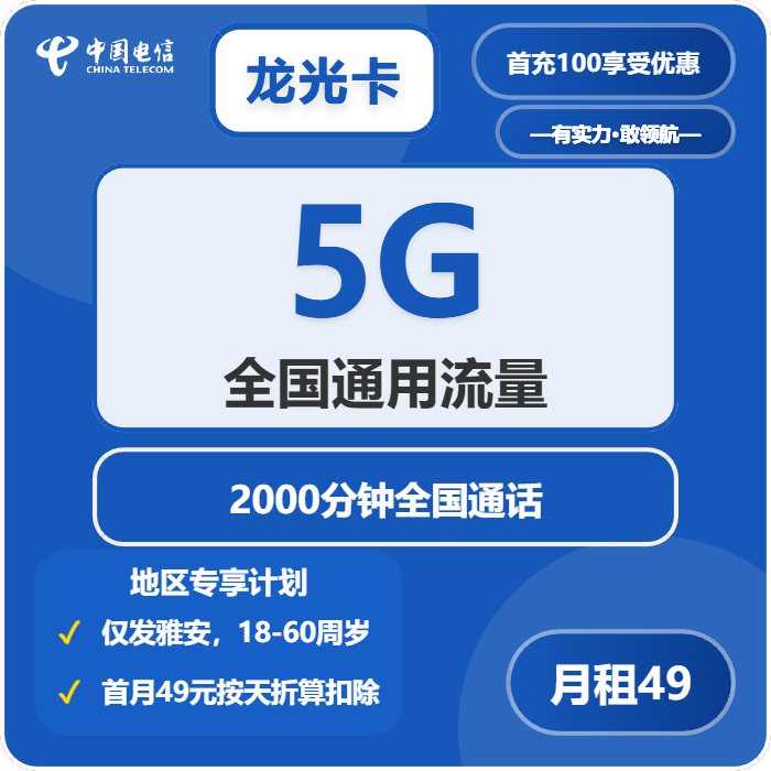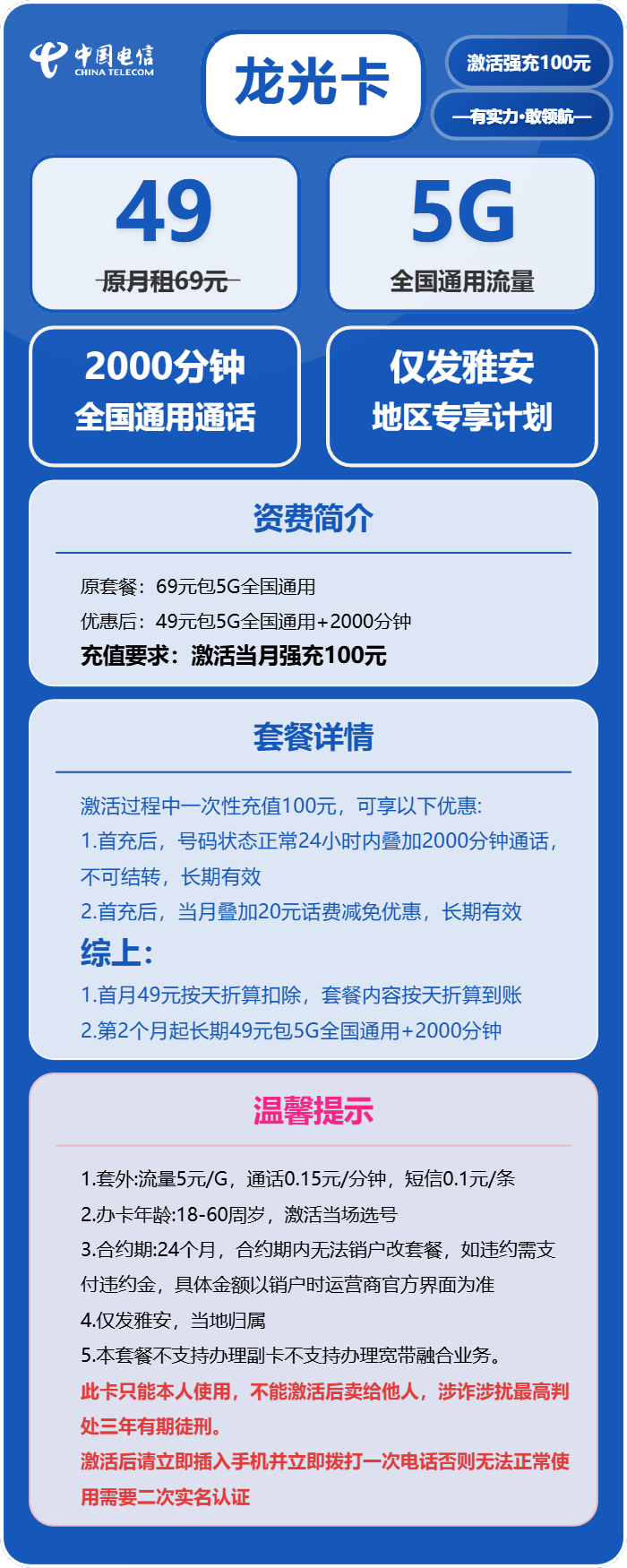 这款电信龙光卡是雅安独有的专属套餐,产品编码71941,主打就是超大通线元/月,还是长期有效的套餐,对比雅安其他电信流量卡,这个长期固定月租的超大通话套餐真的独一份。套餐内容精准贴合通线分钟全国通话,全都是不可结转的,首月套餐内容按天折算到账,5G通用流量够日常聊微信、刷个朋友圈,2000分钟通话不管是办公谈业务还是和家人朋友联系,完全用不完,妥妥的雅安通话党专属卡。